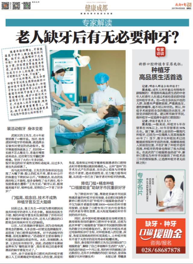 為了降低種牙門檻,幫助更多缺牙市民獲得高質(zhì)量的種植牙使用體驗,成都日報攜手新橋口腔共同開啟“種植牙口福援助金活動”!不僅為缺牙者提供每顆3000~5000的種牙費用報銷,還免除了口腔專用CT拍片檢查等在內(nèi)的術前專項檢查費,最大程度的減輕種牙市民的經(jīng)濟負擔。