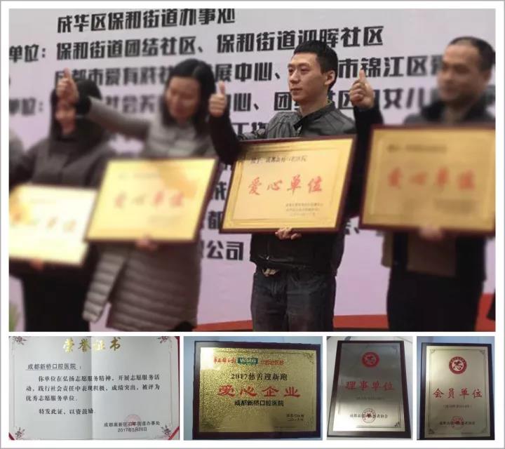 僅在2017年,新橋口腔積極參與公益,憑借組織較多的活動(dòng)次數(shù),專業(yè)的口腔技術(shù),暖心的人文關(guān)懷,得到市民和各主辦方的認(rèn)可,先后獲得2017慈善迎新跑“愛心企業(yè)”、成都高新區(qū)志愿者協(xié)會(huì)授予的“會(huì)員單位”和“理事單位”稱號(hào)、成都高新區(qū)石羊街道辦事處授予“優(yōu)秀志愿服務(wù)單位”、愛有戲社區(qū)發(fā)展中心和成華區(qū)社會(huì)關(guān)愛援助中心共同授予了“愛心單位”等諸多榮譽(yù)。