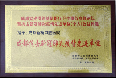 活動現(xiàn)場,成都市衛(wèi)生健康委員會相關(guān)領(lǐng)導(dǎo)對全市抗擊新冠疫情成績突出個人和單位予以了通報表彰,新橋口腔作為其中唯一一家口腔醫(yī)療機構(gòu),榮獲“成都抗擊新冠肺炎疫情先進單位”稱號。