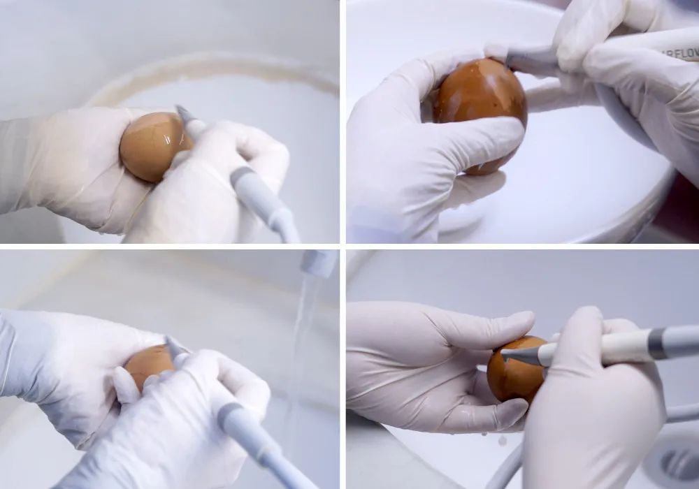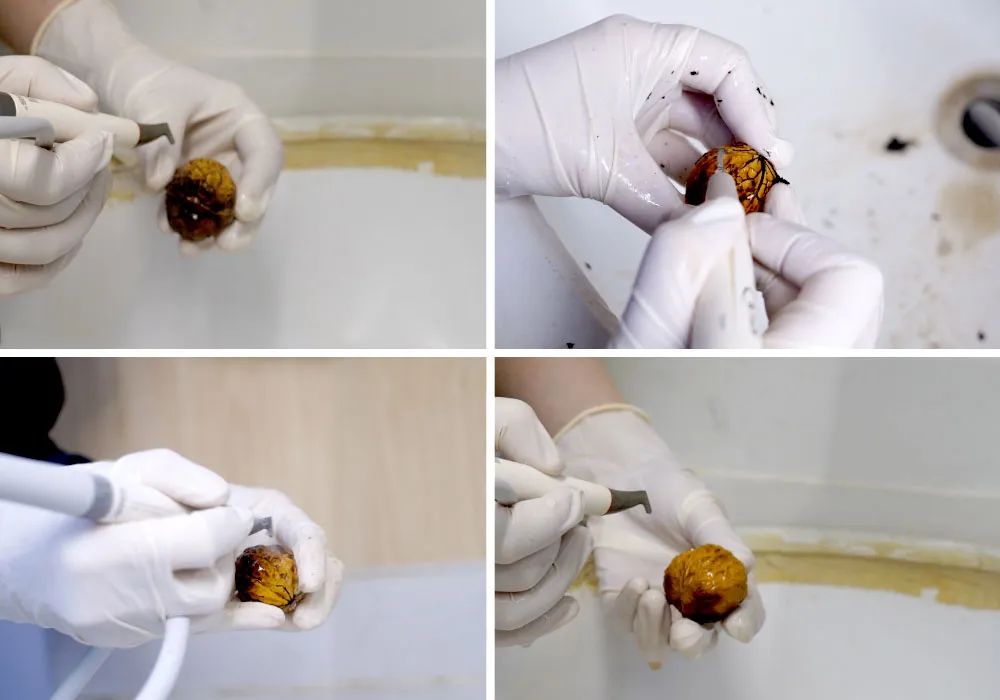 最后的終極檢驗環節,選手們需要在有限時間內先除去鵪鶉蛋表面污漬、斑點,然后通過超聲波去除鵪鶉蛋殼并保持蛋膜飽滿無破損。這不僅考驗潔治力度與手速,更是對選手的潔牙手法技巧、潔牙針尖切入角度和心態的綜合挑戰。