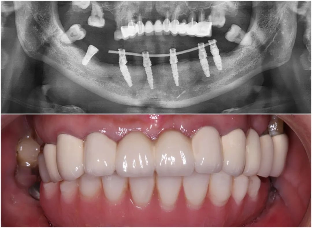 和史阿姨達成共識后,王鋒醫生先為她實施了下半口拔牙和植骨治療。經過大半年的愈合期后,史阿姨牙槽骨量已達臨床種植條件,一次植入6顆植體并戴上臨時牙冠,即刻重拾半口好牙。
