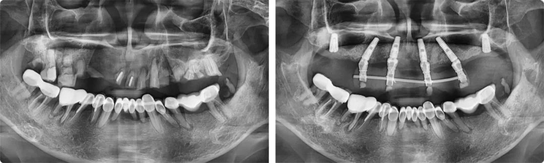葉宏解釋了這樣做的原因:標(biāo)準(zhǔn)的無牙頜種植上頜一般是6-8顆,下頜4-6顆,如果口腔條件允許,他會(huì)建議患者至少要種六顆,這樣牙槽骨受力更加均勻。如果只種四顆,后期的維護(hù)成本相對較高。分兩步走的治療方案雖然麻煩一些,但保障了種植牙的遠(yuǎn)離穩(wěn)定性。