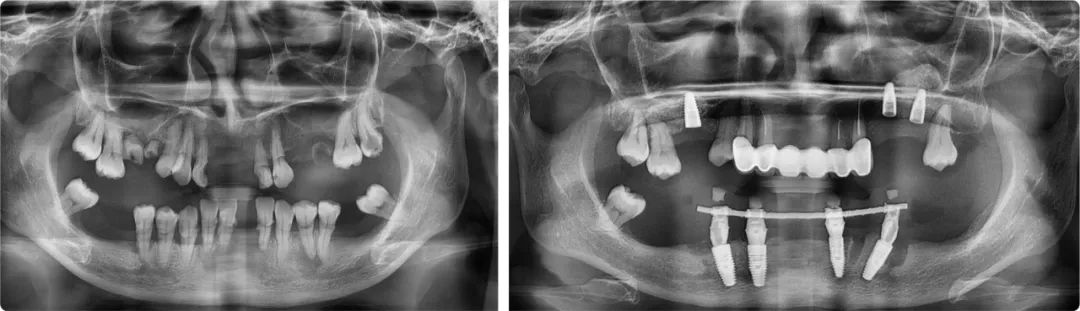 “由于患者后牙牙槽骨垂直性吸收,拔牙后需要種植的位置距離神經管太近,無法種植。為解決這個問題,前牙區的四顆我采用了傾斜種植,盡量把修復的牙位往后移,彌補她后牙區的咀嚼功能。”