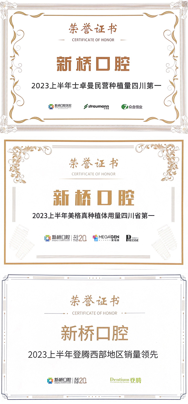 全球知名植體品牌瑞士士卓曼、韓國美格真、韓國登騰在活動現場分別為新橋口腔頒發了“2023年上半年民營種植量四川第一”、“2023年上半年種植體用量四川省第一”及“2023年上半年西部地區銷量領先”的榮譽獎牌。