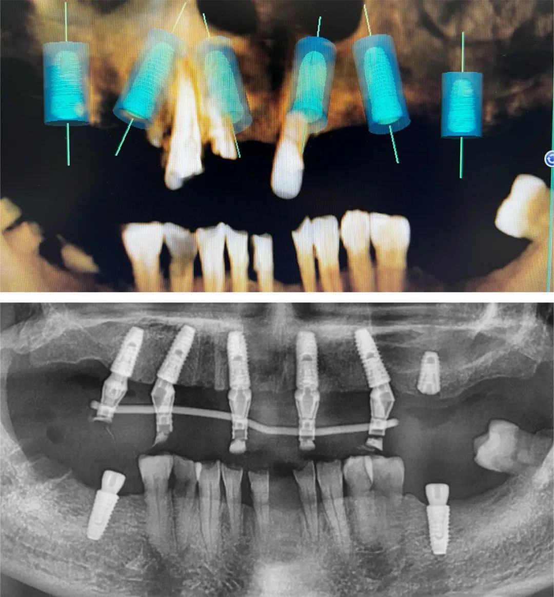 新的方案選擇了短植體,長度不會觸及和破壞上頜竇的囊腫壁,不造成炎癥擴散,再通過黏膜提升讓植體的一部分在竇腔內自行成骨。這樣,阿姨當天就完成了上半口即拔即種,戴著牙離開了醫院。