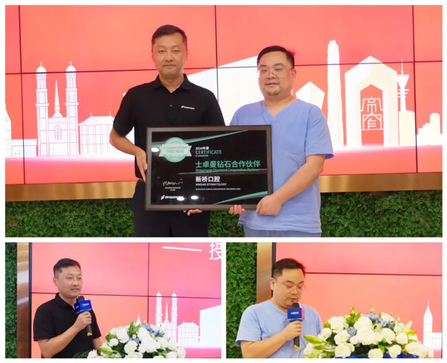 授牌儀式上,瑞士士卓曼(ITI)西區大區負責人崔鵬飛為新橋口腔頒發了“鉆石合作伙伴”榮譽牌,崔鵬飛表示:“新橋口腔是士卓曼(ITI)西南首家全鋯診室,以絕對實力奪得2023年士卓曼(ITI)種植體四川省用量第一。我們通過對業內顧客口碑、品牌實力、種植技術水平等多維度考量,最終將士卓曼(ITI)西部目前唯一‘鉆石合作伙伴’授牌給新橋口腔,我們為有這樣高水平的伙伴而榮幸,希望未來雙方繼續精誠攜手,為西部種植事業發展再添新彩!”