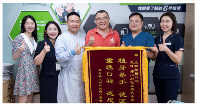 從澳洲飛回成都新橋口腔種牙,李叔叔說自己實現了品質、效率和性價比三贏!為此,他親自送來一面自己題詞的錦旗,“植牙圣手,德醫雙馨!”他說:“牙齒種好了,感覺好極了!非常感謝王鋒總監團隊,讓我從此再享口福!”