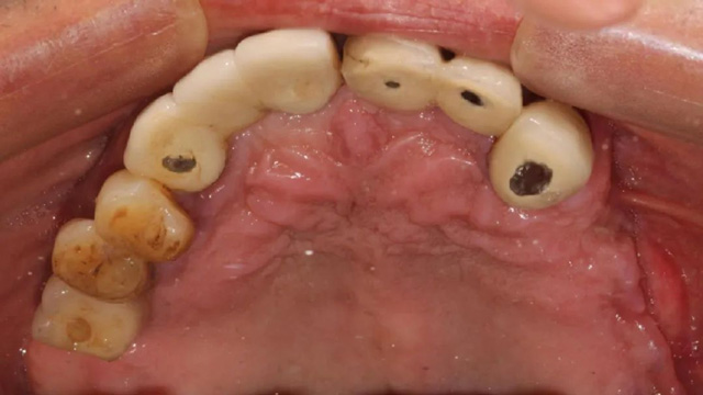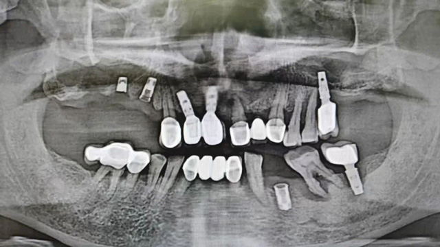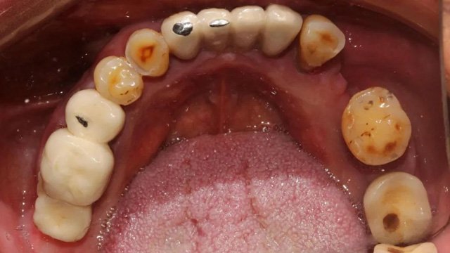 “上面種了4顆,斷了兩顆,脫落1顆,只有1顆能用,下面有一顆牙冠脫落,另一顆有種植體周圍炎,有明顯的骨吸收。”吳叔叔剩下的天然牙也不好,做了幾處修復,之前的牙冠修復用的都是烤瓷牙,有好幾顆磨損嚴重露出了金屬。由于存在缺牙、不良修復體等情況,口腔整體咬合紊亂,進食很困難。