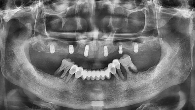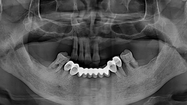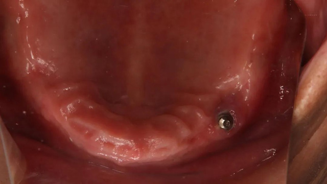 “他的下牙長期存在牙周問題和不良修復(fù)體,牙齒基本上都松動(dòng)了,為了增強(qiáng)穩(wěn)定性我給出的方案是種6顆而不是4顆。很幸運(yùn)他的骨量不算太差,通過少量植骨后進(jìn)順利埋入了6顆種植體。”
