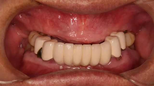 60歲出頭時(shí),王先生嘴里還剩下10顆牙,尷尬的是,上下有牙的地方剛好完美錯(cuò)開。上面雖有4顆前牙鎮(zhèn)守門面,無奈下面的6顆牙卻分散在左右兩側(cè),完全碰不上。為了能吃東西,他去診所給下牙安了一個(gè)烤瓷聯(lián)冠,用左右各兩顆牙當(dāng)做橋墩做了一個(gè)超長的橋架。