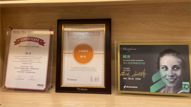 在新橋“傳幫帶”體系的助力下,韓沛跟隨經驗豐富的前輩們潛心學習,迅速成長。但他總覺得自己掌握的知識還不夠多,工作之余,他的身影頻繁出現在各類口腔醫學培訓課堂和學術研討現場。他學習瑞典Nobel種植系統;通過考核成為德國Bego系統認證醫生;參與BLX-即刻種植培訓,不斷拓寬自己的技術邊界;遠赴新加坡參加ITI世界研討會,他與全球頂尖專家交流,汲取最新理念與技術靈感。2024年,在新橋病例大賽中,韓沛憑借扎實積累和靈活運用,一舉斬獲卓越病例獎。