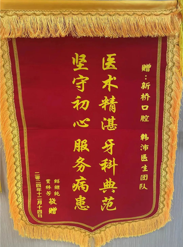 還有一對老兩口,在韓沛這里做常規種植牙。種植過程中,老兩口幾乎沒感覺到疼痛。“就跟自己原來的牙一樣,現在吃飯都不惱火了,美得很。”修復后效果絕佳,為表感激,老兩口特意送來了錦旗,上面寫滿了對韓沛的贊譽。