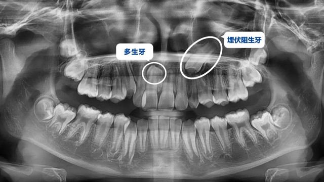 簡單地說,牙齒不整齊只是小問題,他更大的問題是:在不該長牙的地方多長了一顆牙,而乳尖牙滯留,早該替換出來的尖牙長不出來,這兩顆牙的問題如果不及時干預治療,會帶來很多長期的口腔問題。