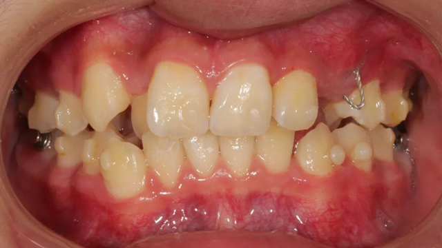 這位小患者的口腔問題包括:牙列不齊,個別門牙反頜,左上尖牙完全埋伏阻生,另外,CBCT顯示右上門牙牙根腭側內還有一顆多生牙。
