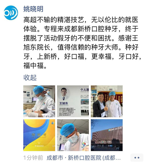 2025年3月13日,年逾60歲的姚曉明教授在新橋口腔成功完成了第四次種牙治療。一如既往的高品質服務,讓他忍不住在朋友圈贊嘆:“高超不輸的精湛技藝,無以倫比的就醫體驗。”與此同時,他還分享了自己與新橋口腔之間的深厚緣分。