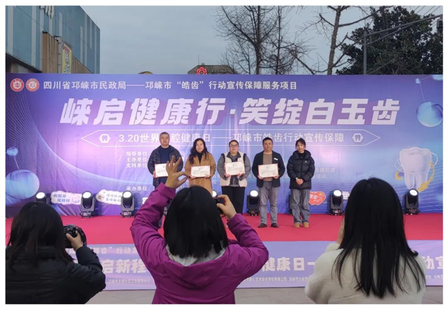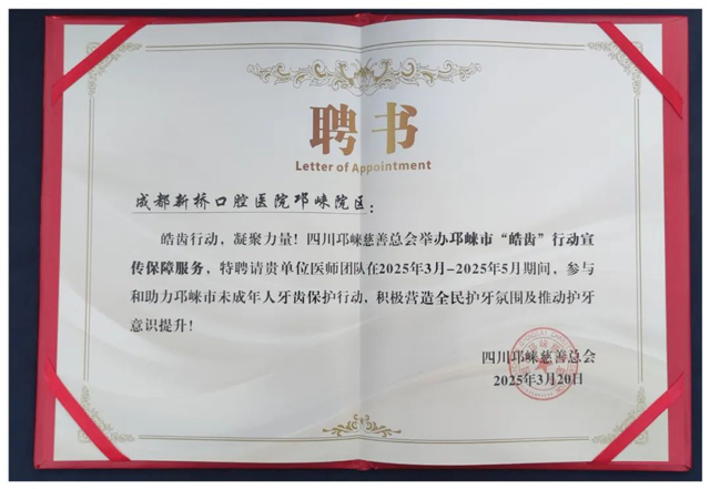活動期間,四川邛崍慈善總會向成都新橋口腔醫院邛崍院區代表頒發了皓齒宣傳保障聘書。新橋口腔成都邛崍院區代表表示,“我們將全力以赴參與并助力邛崍市未成年人牙齒保護行動,積極營造全民護牙的濃厚氛圍,推動全民護牙意識的顯著提升。”