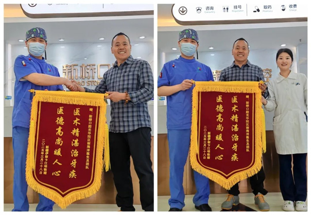 近日,來自新疆伊犁的卞先生,將一面寫有“醫術精湛治牙疾 醫德高尚暖人心”的錦旗,親手送到了新橋口腔成都光華院區種植專科副主任醫師謝海洋手中,一句“值得”道出了一段雙向奔赴的醫患情……