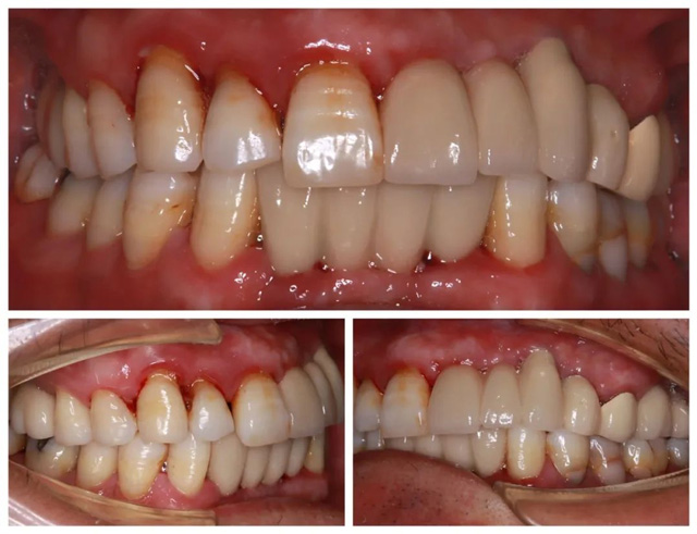 因牙周病的困擾,卞先生僅30多歲牙齒便接連松動脫落。2012年曾在伊犁某口腔機構進行烤瓷固定橋修復,但受限于當地醫療條件,且隨著時間推移,上下頜前側的多處修復體逐漸松動,加上上頜1顆前牙和右側2顆磨牙的脫落,導致卞先生的咀嚼功能嚴重受損。