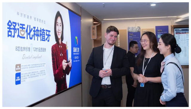 通過院內科普資料,Tobias Speicher一行首先了解了新橋口腔舒適化種植牙兩項核心特色——“金標準”和“12對1”品質服務。新橋口腔舒適化種植牙金標準,是一套覆蓋術前、術中、術后的全流程臨床規范,通過八大核心環節確保手術安全與舒適體驗。而“12對1”品質服務,是指由12個專業崗位組成服務團隊,為每位種牙顧客提供全程專屬服務。Tobias Speicher對新橋口腔將臨床規范與人文關懷完美結合的診療模式表示高度贊賞,認為其:“不僅體現了醫療專業度,更彰顯了醫療服務的溫度。”