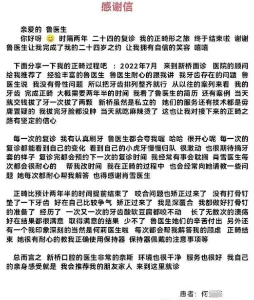 謝謝魯醫生讓我完成了我的二十四歲之約,讓我擁有自信的笑容日前,新橋口腔正畸專科主任魯維希收到了一封復診顧客的電子版感謝信。在信中,顧客何女士訴說了自己的正畸經歷,字里行間充滿了溫暖和感謝。……