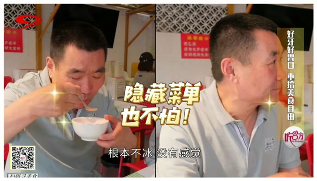 挑戰最后,主持人妖精呈上了一早便準備好的“隱藏菜單”——冰鎮糖番茄,甜蜜蜜的果肉與滿滿的碎冰相生相融,這道夏日降溫神器,卻是牙口不好人群的“禁忌”美食!主持人妖精坦言:“因為我們知道牙不好的時候,其實吃冰的,有點不舒服。”然而擁有一口好牙的口福品鑒團團員們則紛紛表示:“現在隨便吃!”