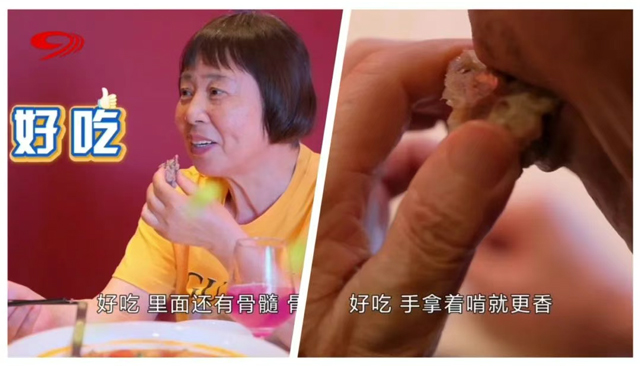 第二道關(guān)卡是以秘制鹵水腌制、經(jīng)烘烤風(fēng)干而成的秘制風(fēng)干骨。咸鮮入味的肉質(zhì)遍布硬骨之上,只有牙口好才能啃得香。在新橋口腔種好全口牙的趙阿姨在品味后說(shuō)道:“好吃,里面還有骨髓。”而同樣種了滿口好牙的吳叔叔則直接上手啃得過(guò)癮:“好吃,手拿著啃就更香。”