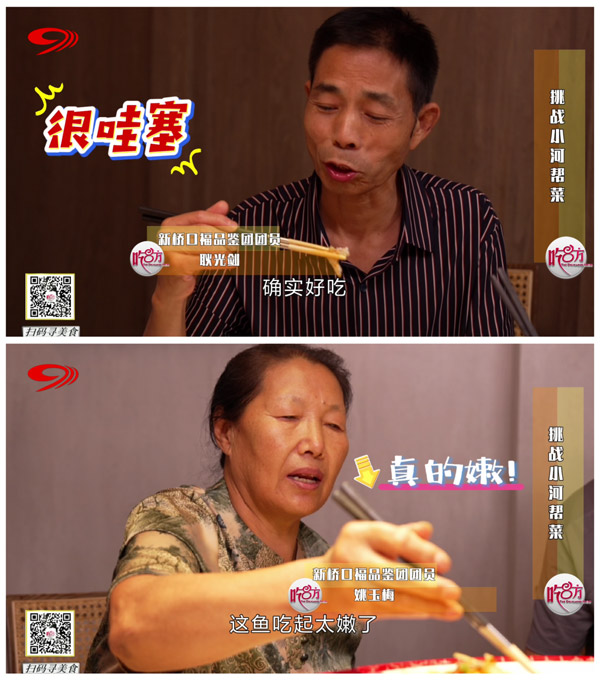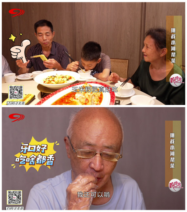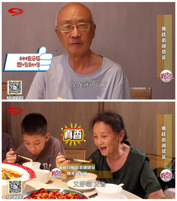 口福挑戰第一關,是以“鮮、活、燙、辣”為特色的招牌菜——非遺活渡魚,“渡水烹飪”的鮮魚佐以大量青紅辣椒與姜絲,端上桌時還冒著熱氣,非常考驗牙齒對燙和辣的忍受力。種好牙后的耿叔叔表示:“確實好吃,鮮、香、嫩!”一口魚肉入腹,姚阿姨也連連贊道:“這魚吃起太嫩了!”而姚阿姨的老伴卻不禁感嘆:“以前(她)沒種牙的時候,魚是想吃不敢吃,但是現在隨便吃了!”