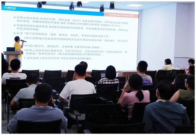 研討會(huì)現(xiàn)場,國內(nèi)知名種植專家就種植體周圍炎的處理經(jīng)驗(yàn)進(jìn)行主題分享:“需要通過視診、觸診、種植體周探診以及影像學(xué)檢查等系列臨床檢查,才能判斷種植體周圍炎是否發(fā)生。”并就處理種植體周圍炎的關(guān)鍵注意事項(xiàng)進(jìn)行深入分析:“種植體周圍炎需結(jié)合臨床分型(輕度、中度、重度)進(jìn)行處理,同時(shí)還需兼顧感染控制、軟硬組織再生及種植體周的長期維護(hù)等。也要求醫(yī)生建立長期隨訪機(jī)制,通過制定個(gè)性化維護(hù)方案達(dá)成良好的預(yù)防效果。”