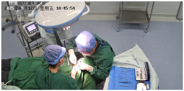 隨著手術正式開始,鏡頭轉向三級標準的手術室。本次主刀醫生由新橋口腔醫療總監王鋒擔任,擁有數萬成功種植案例經驗的他手法嫻熟沉穩,每一步操作都流暢而清晰。