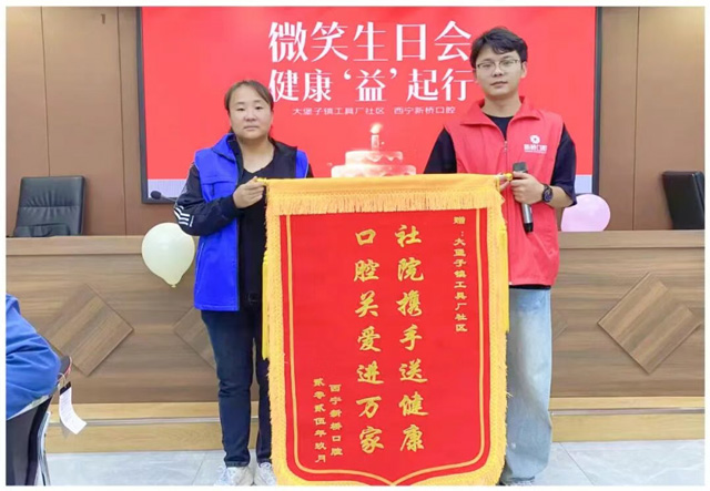 活動尾聲,在全體人員齊唱生日歌、共送祝福的溫馨氛圍中,西寧新橋口腔向工具廠社區贈送了印有“社院攜手送健康,口腔關愛進萬家”的錦旗,以此感謝社區對公益健康事業的大力支持與緊密協作。