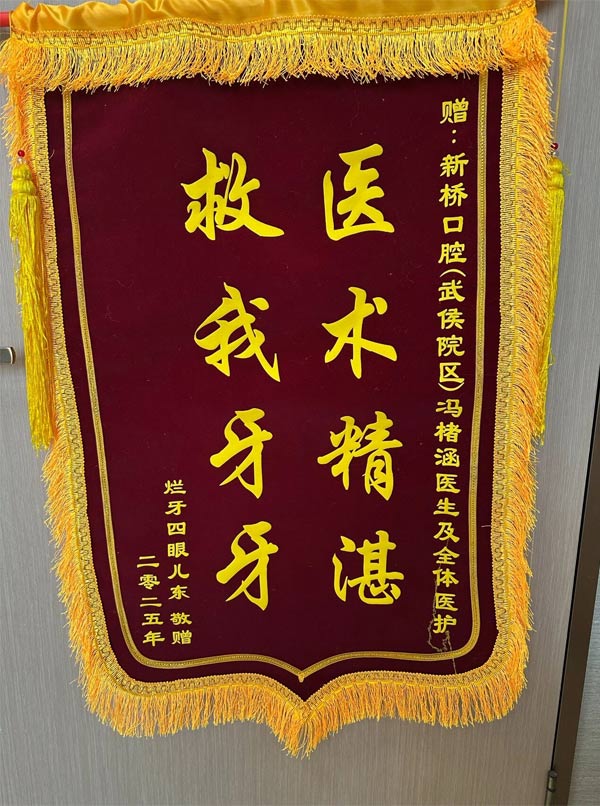 馮楮涵醫(yī)生強調(diào):“小文的情況是個很好的正面教材。齲齒作為最高發(fā)的口腔疾病,初期往往不痛不癢,容易被忽略。但他一發(fā)現(xiàn)異常就及時就醫(yī),這為我們爭取了實施保守治療的機會窗口。如果一拖再拖,等到牙髓發(fā)生感染、出現(xiàn)自發(fā)痛或夜間痛,那時就真的只能進行根管治療了。早一步處理,不僅痛苦小、療程短,更意味著更多的治療選擇和更好的遠期效果。”治療結束后,小文對效果非常滿意,特意定制了錦旗表達謝意。“這面錦旗不僅是感謝他們能理解我的顧慮,更是希望他們的專業(yè)和耐心能幫助更多人。”